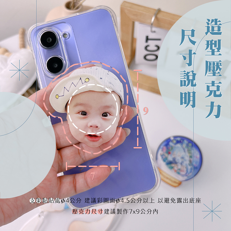 | 圖檔尺寸 | ◉ 支架黏貼處Ø4cm,會在意露出黏貼底座的買家...彩圖請製作Ø4.5cm以上的遮擋範圍。 ◉ 造型壓克力(刀模)請製作 7x9cm內尺寸。 - ◉ 圖檔黑色的部分請做「四色黑」 |