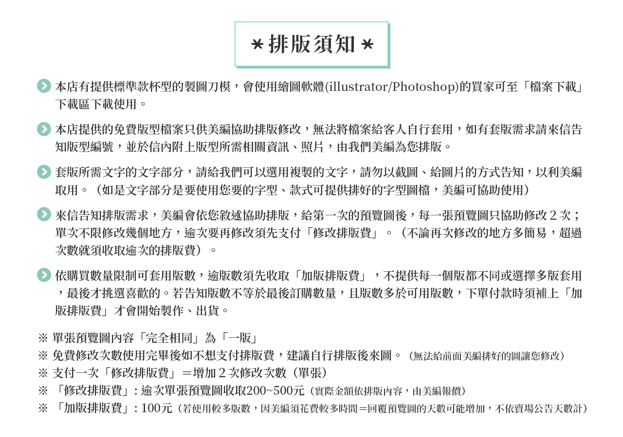 ⦿請於[信內]備註圖檔/訂製需求(要製作的商品、套版的版型編號...等)