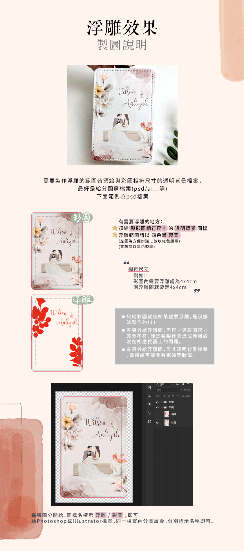 出血7.8*11.8 cm / 安全範圍6.5*10.5 cm *縫線約在7*11 cm處, 重要圖文建議避開0.5cm以上 ◉ 圖檔黑色的部分請做「四色黑」 ◉ 若有加購特殊效果:上光/浮雕, 效果圖層也請請做「四色黑」 ((四色黑:K100 / C100 / M100 / Y100)) |