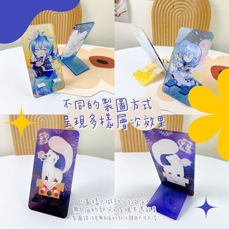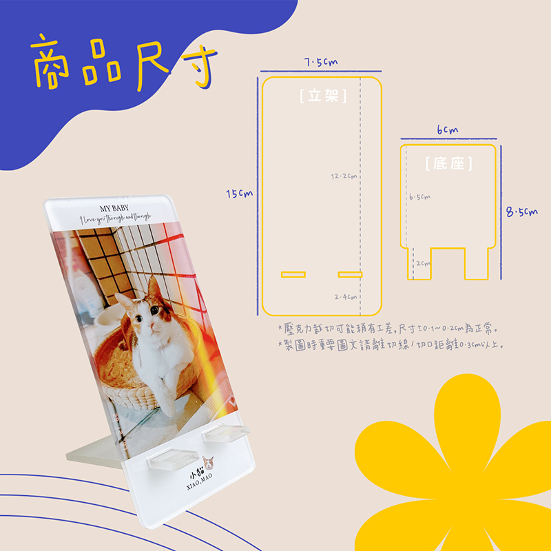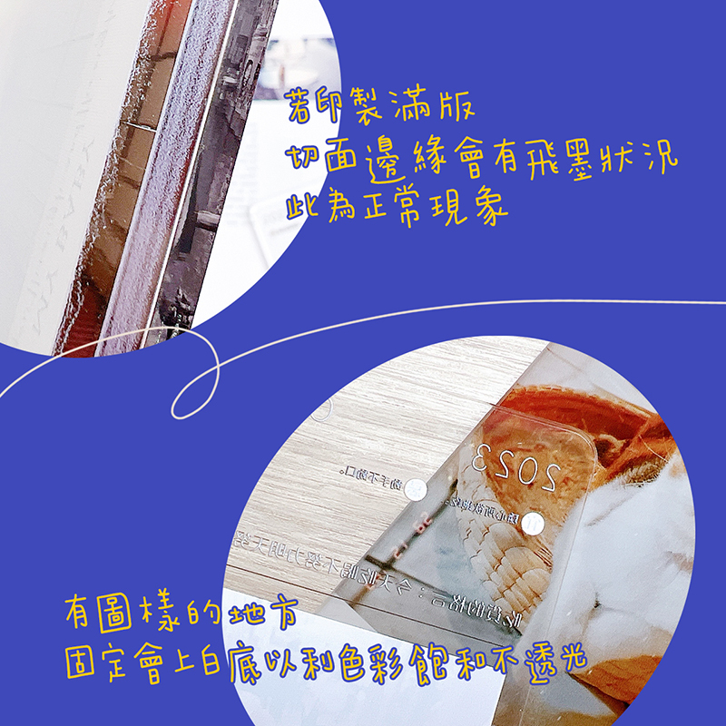 | 備 註 | ◉ 印製滿版圖:若邊緣常有摩擦,邊緣圖會較易脫落,會在意的買家請避免此行為,或是製作非滿版圖樣。 ◉ 商品以人工擺放方式印刷,印刷圖樣不保證100%置中印製,有一定機率偏移,如會在意請避開框線感明顯的圖樣設計。 ◉ 透明視窗可能會有細微不明顯刮痕,為正常現象。 ◉ 賣場介紹如無詳盡之處,有疑慮可LINE客服詢問確認。 ◉ 壓克力依生產方式,厚度有±0.3~0.5mm的公差為正常狀況。 |